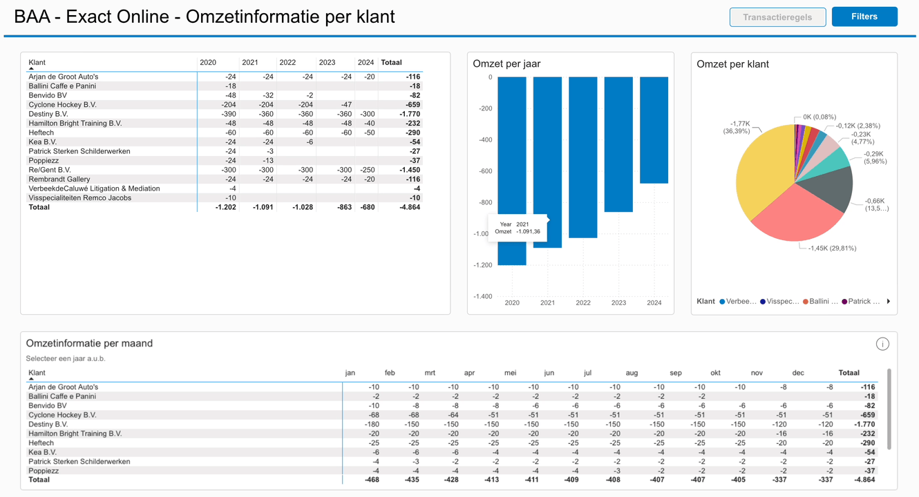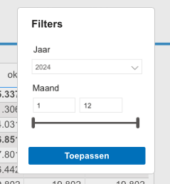 Veelvoorkomende slicers, zoals de jaarselectie, zijn gesynchroniseerd tussen verschillende pagina's. Als je op één pagina het jaar wijzigt, dan zal dat ook gebeuren op andere pagina's met een jaarselectie. Klik op 'Toepassen' of op het gebied buiten het filterpaneel om het paneel te sluiten.