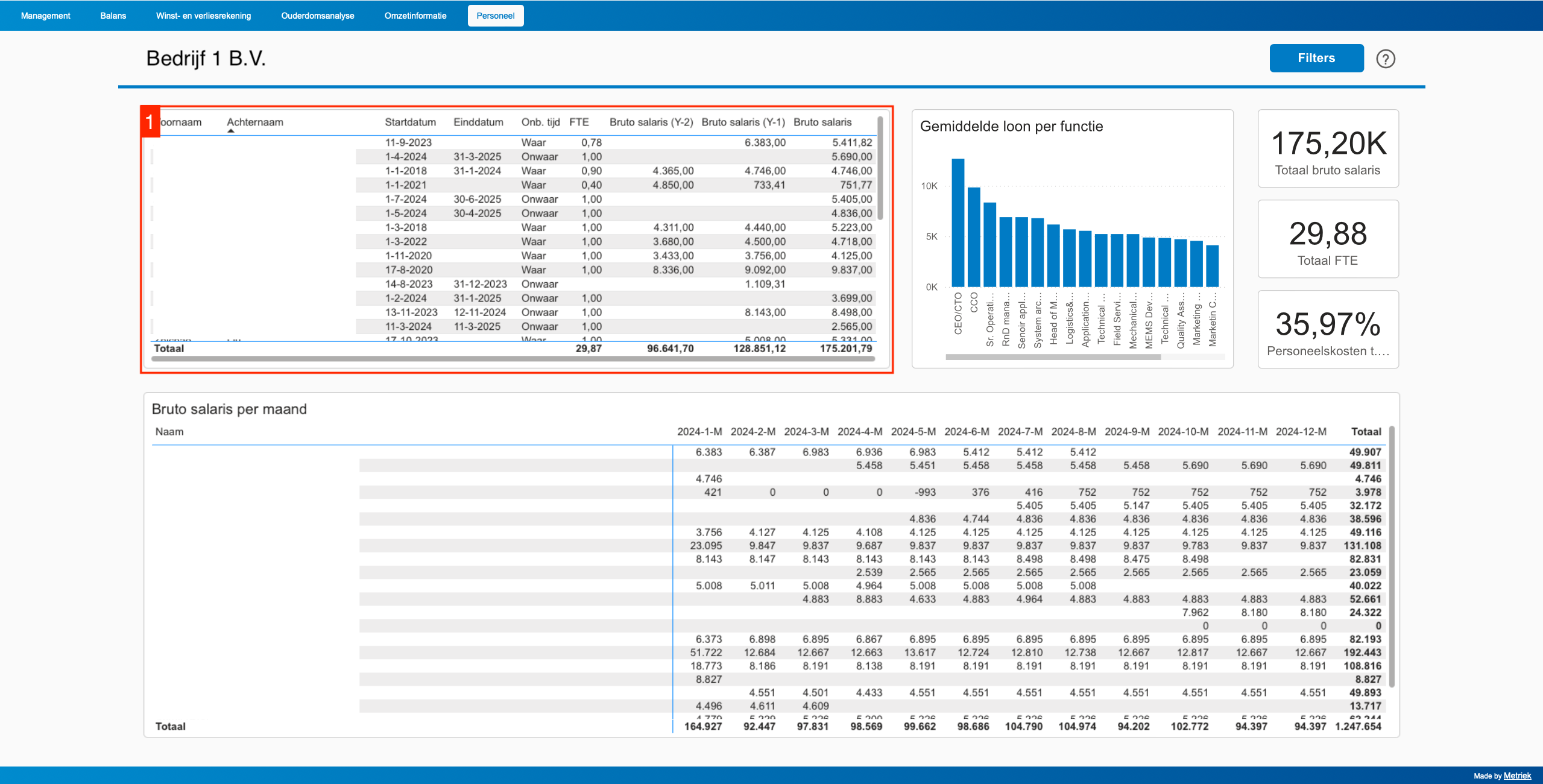 | Bruto salaris | Peildatum: vandaag. 'Bruto salaris fulltime' van het laatst toegevoegde salaris (t.o.v. de peildatum), vermenigvuldigt met de waarde van FTE op de peildatum. |
