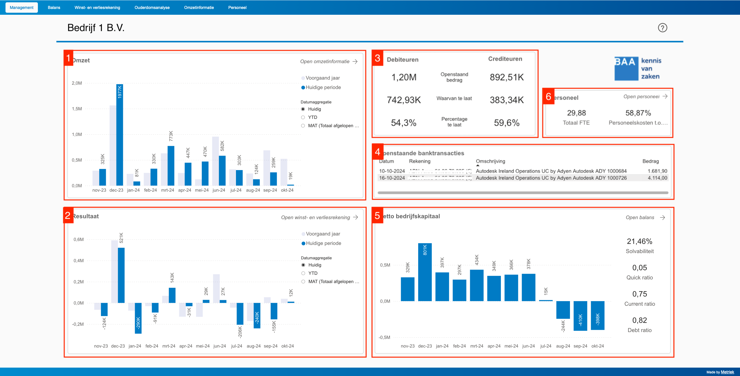 - Personeelskosten t.o.v. operationele kosten: het totale brutoloon van alle werknemers zoals weergegeven in het personeelsoverzicht, gedeeld door de 'Operationele kosten' zoals weergegeven in de winst- en verliesrekening.