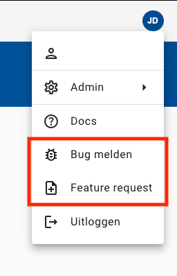 Support Fouten melden Gaat er iets fout? Klik dan op uw initialen rechtsboven en vervolgens op 'Bug melden'. Verzoek tot nieuwe functionaliteit indienen Ontbreekt er een functie? Klik dan op uw initialen en vervolgens op 'Feature request'.